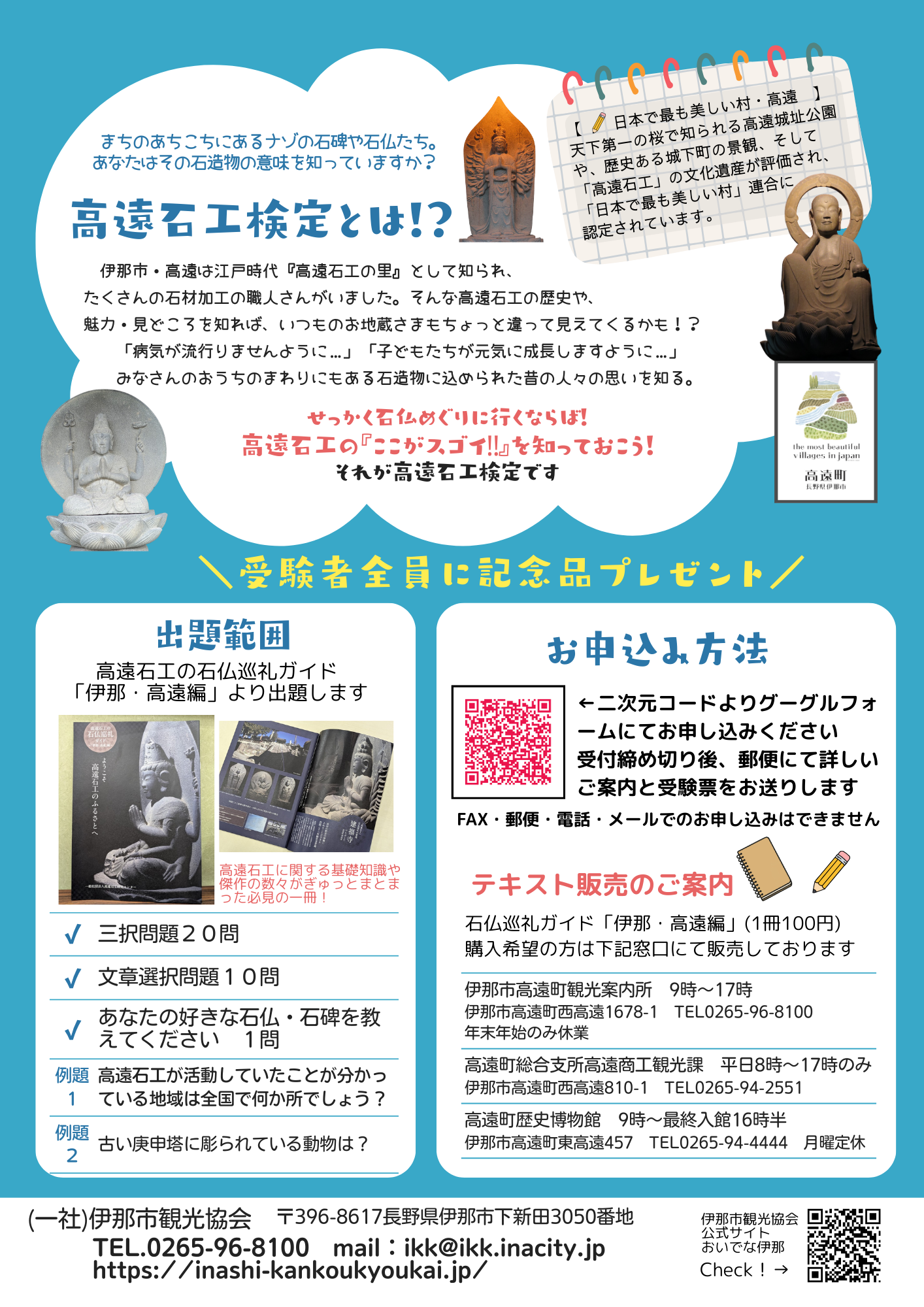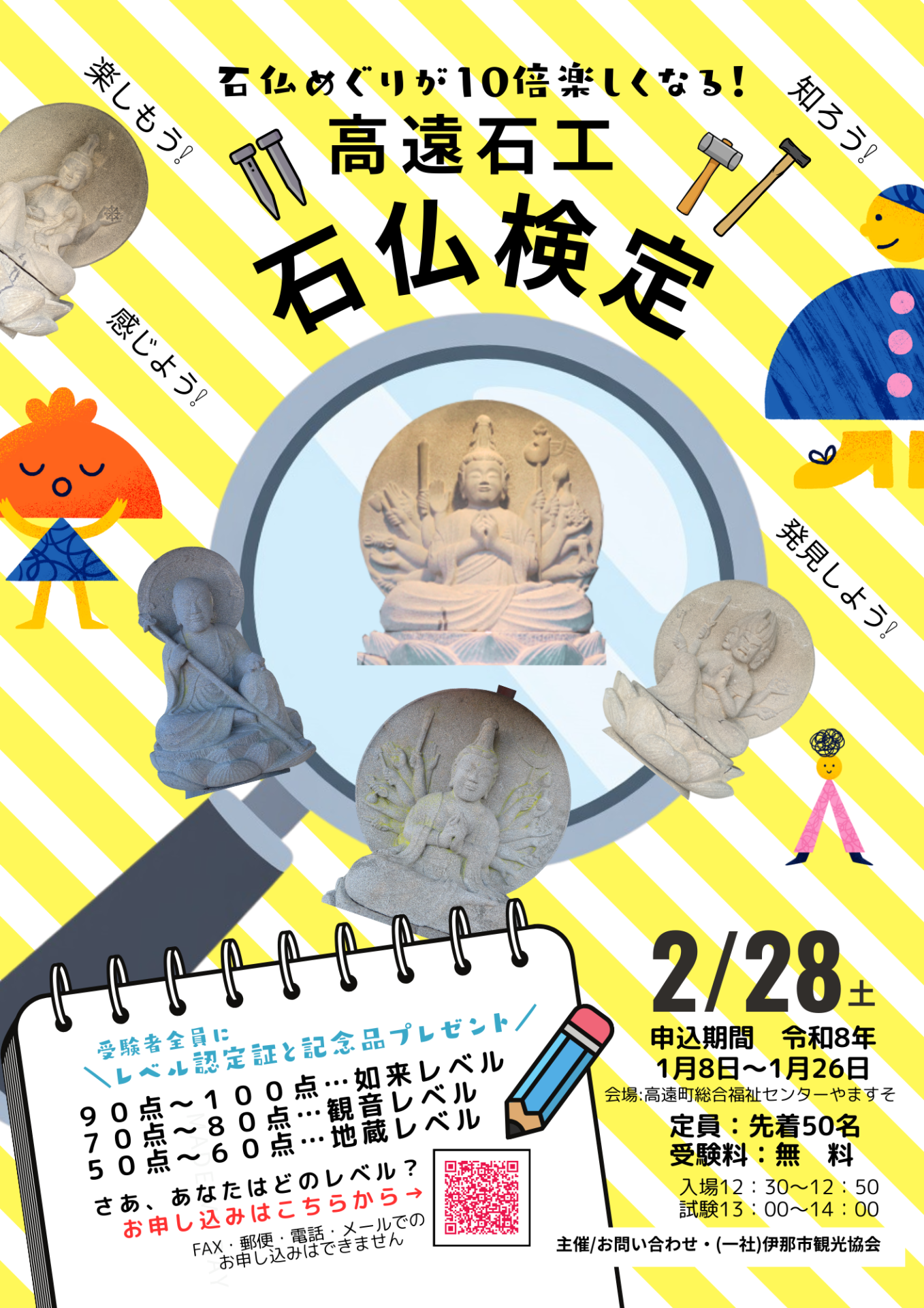 (一社)伊那市観光協会では【高遠石工のここがスゴイ!!】を多くの方に知っていただき、より楽しんでいただくべく、「高遠石工・石仏検定」を実施します。